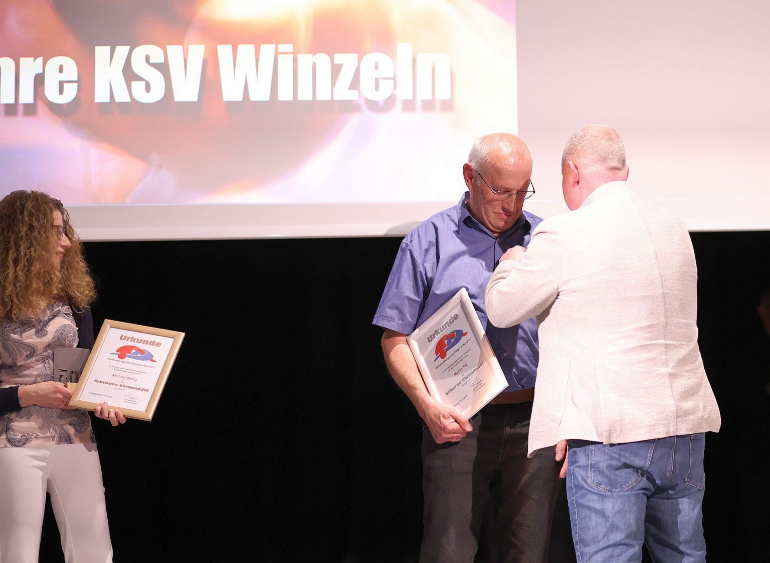 Zu Ehrenmitgliedern des KSV Winzeln wurden Reinhold Hezel, Martin Zyma (Schuster) und Hubert Haug ernannt. Als Moderator führte Karl-Heinz Hezel durch das Programm, das mit Filmblöcken über das bisherige Vereinsgeschehen erweitert wurde und durch eine besondere „Modeschau“ mit Trainingsanzügen der letzten Jahrzehnte abgerundet wurde.